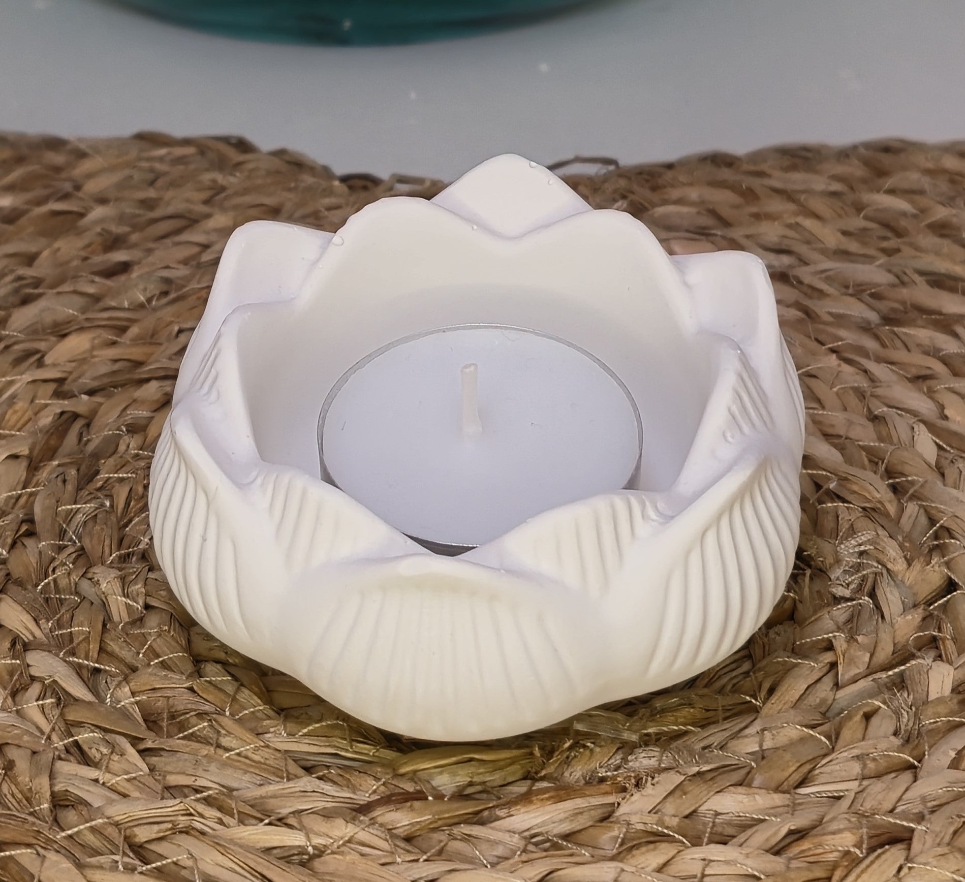 Ilumina tus espacios con la delicadeza de lo artesanal. Este portavelas en forma de flor de loto, elaborado a mano en cerámica blanca, transmite calma y armonía. Su diseño refinado lo convierte en un complemento ideal para cualquier rincón del hogar, altares o espacios de meditación.