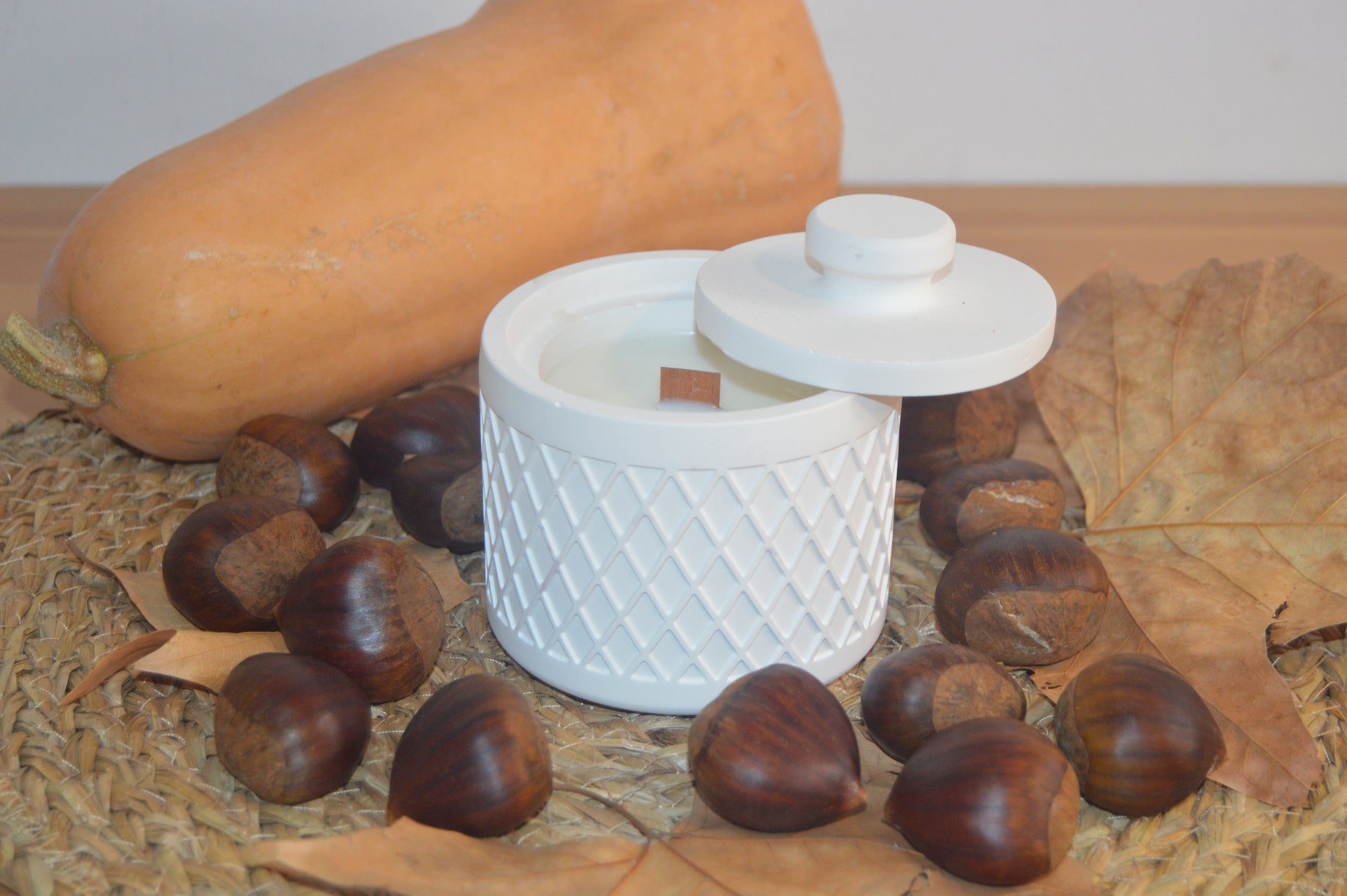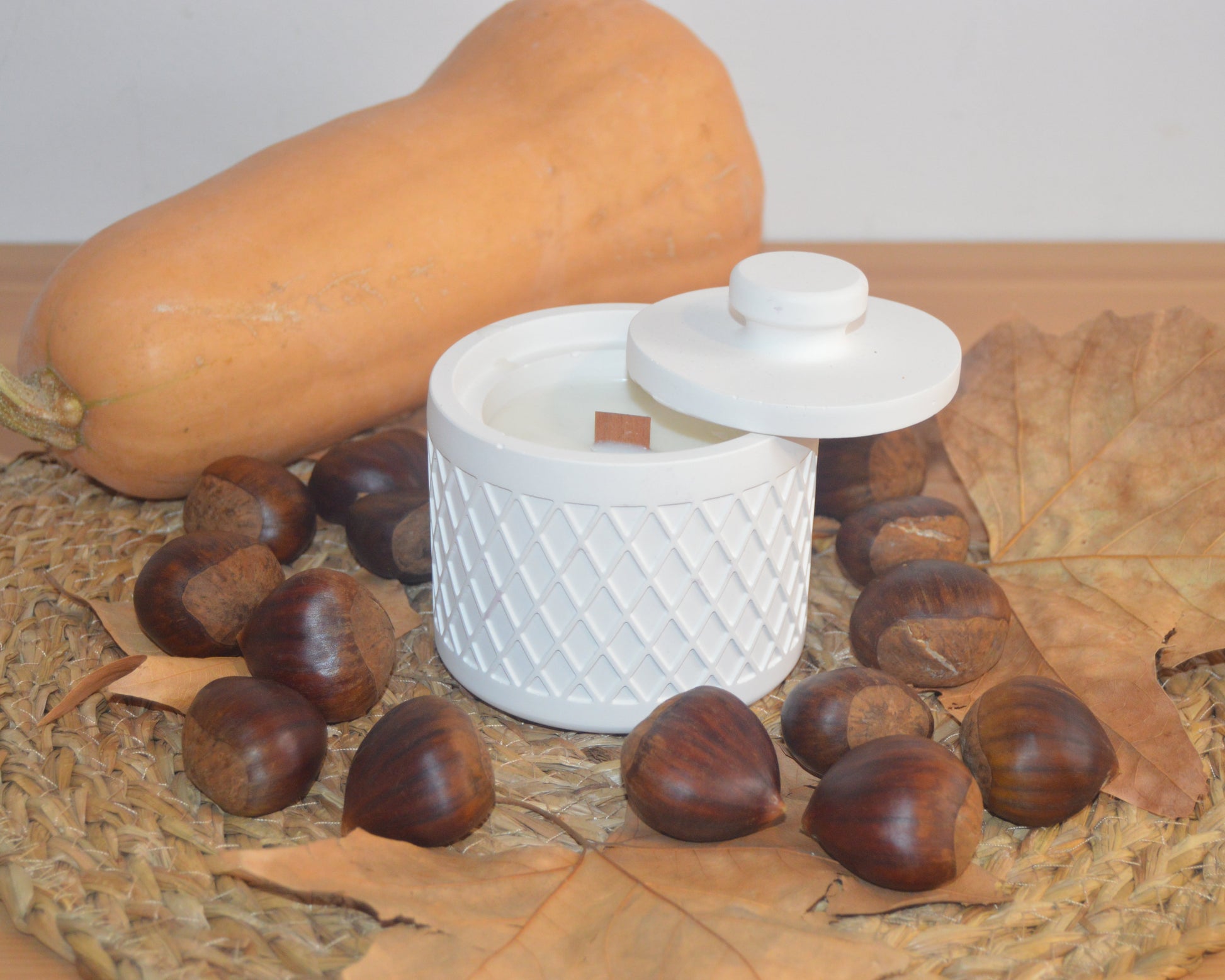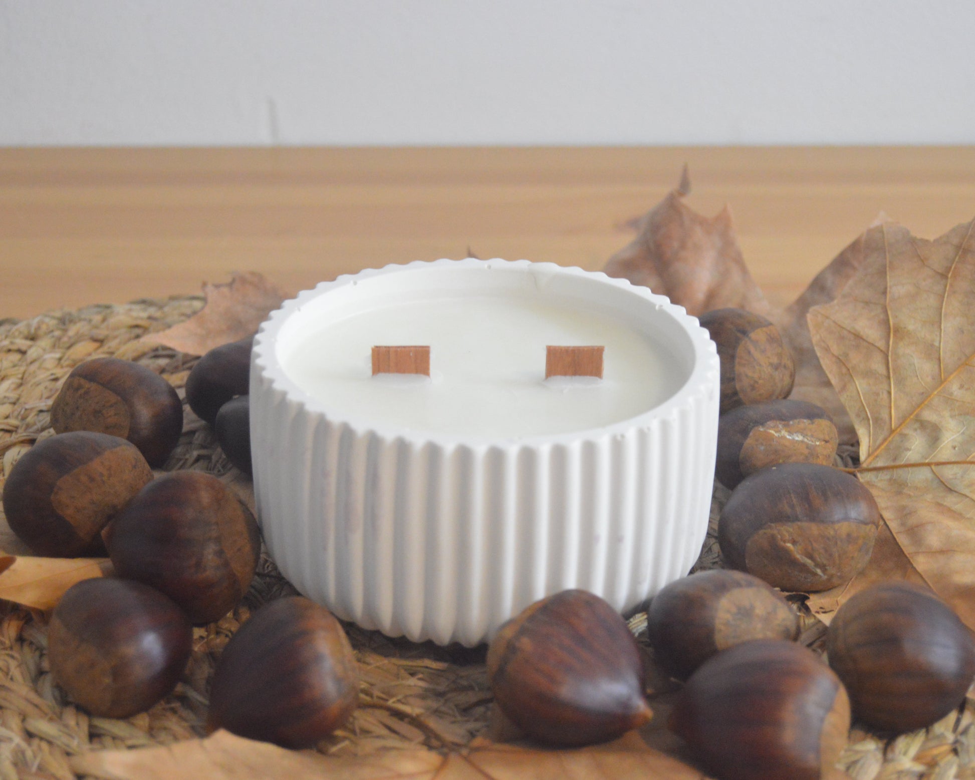 Imagina una vela cálida y tentadora en un recipiente de cerámica artesanal, con un tono suave y textura natural que invita al confort. Al encenderla, su fragancia a bombón de castaña se despliega con una dulzura envolvente y elegante.